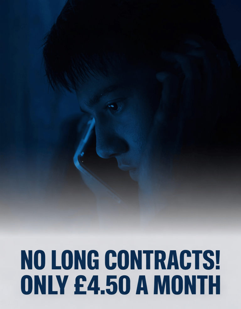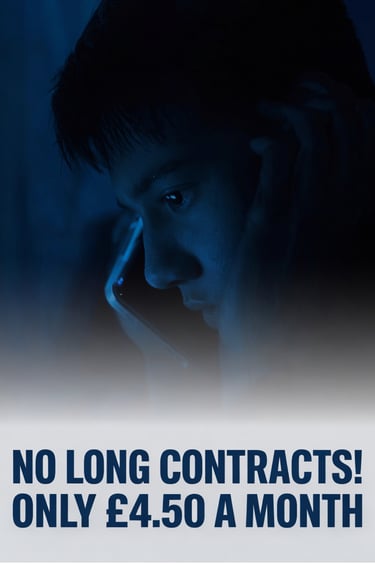 A lonely man on a phone call with unlimited minutes for £4.50 per month on a neon sign.A lonely man on a phone call with unlimited minutes for £4.50 per month on a neon sign.